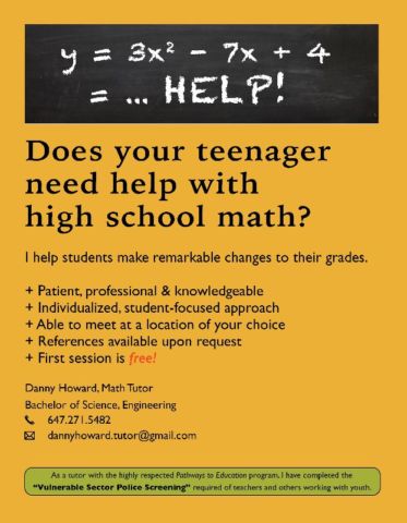 Is your son or daughter having trouble with a new grade level? Are they anxious or losing confidence in their abilities in math? Is your son or daughter having trouble with a new grade level? Are they anxious or losing confidence in their abilities in math? I’ve tutored over 50 students from Bishop Allen Academy, Etobicoke Collegiate Institute, Etobicoke School of the Arts, and several more schools in the area.Book a FREE one-hour session at a location most convenient for you (your home or a public library).